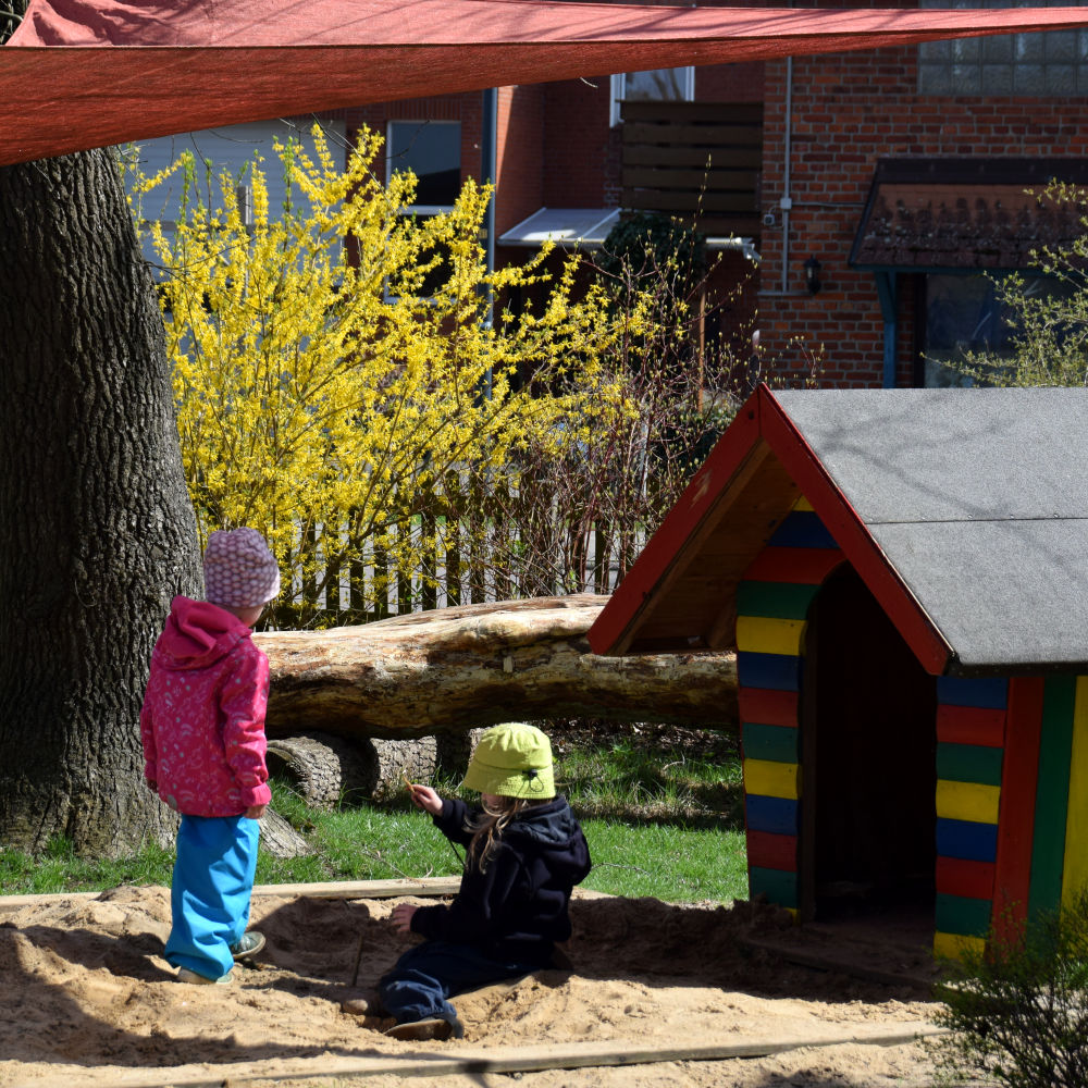 Natürliche Baumaterialien werden zur Ausgestaltung des Rollenspiels genutzt, der Sand wird für Bauarbeiten, zum Torten backen und Schatz suchen heimgesucht und die kindgerechten Hügel, Kletter- und Balancierbäume bieten dem Kind unerschöpfliche Möglichkeiten sich und seinen Körper im Spiel auszuprobieren und besser kennen zu lernen.
